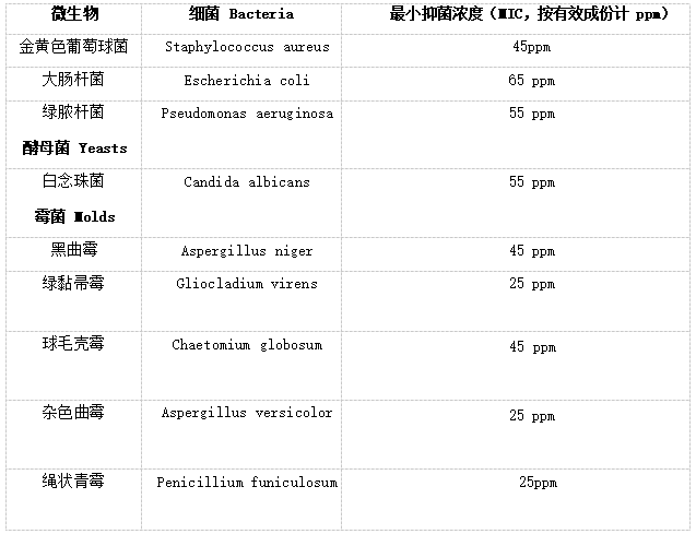 殺菌廣譜,抗菌、防霉;不流失,高效,穩定,長效; 可以與食品接觸;在強紫外線和酸雨條件下穩定;環保,對人體與環境安全;不含砷,不含錫等重金屬; 不揮發,不變色;耐高溫 320 度,和高聚物相容性好。